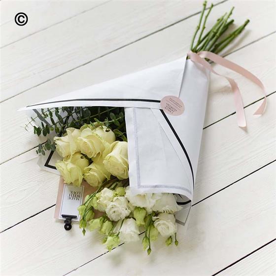 A relaxed collection of lush white flowers in a chic white gift wrap. Beautifully minimal, the lucky person receiving them has creative freedom to arrange them just how they like.