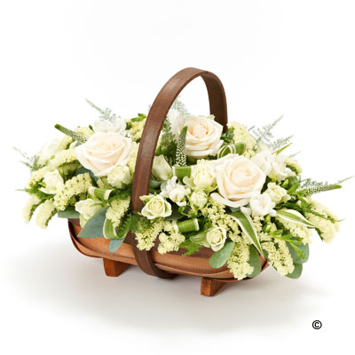A traditional trug basket filled with roses, veronica, statice and scented freesias in fresh white with green foliage.