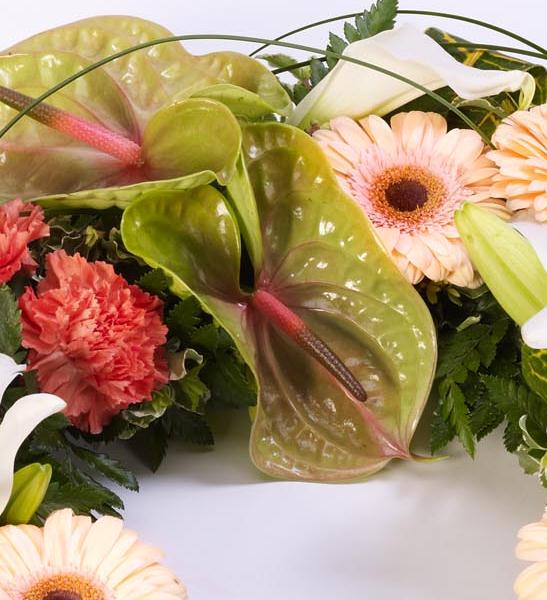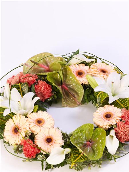 An elegant wreath featuring an exotic mix of anthuriums, calla Lily, Gerbera, Lily and carnations in green, orange and white. Tropical foliage and looped steel grass give it a contemporary feel.