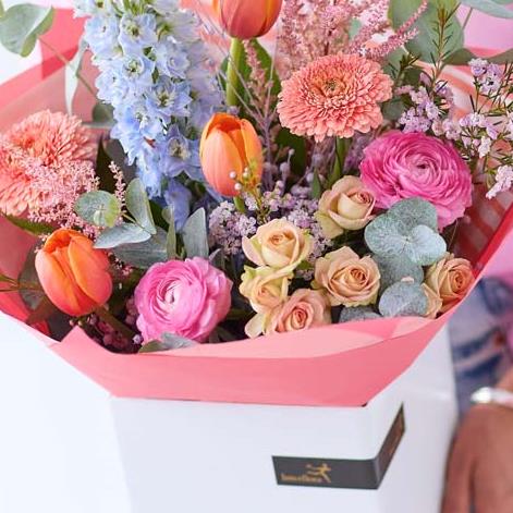 A gorgeous bouquet of fresh flowers, expertly chosen, arranged and delivered by the florist. This year our Mother’s Day designs are all about gorgeous pastels with pops of colour. Expect to see shades of baby pink, cream, and lemon with bursts of cerise and tangerine, and highlights of pale blue and lilac.