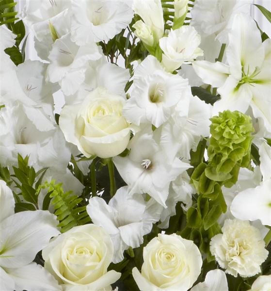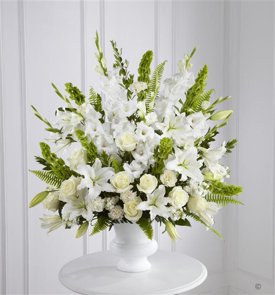 This stunning urn arrangment is a beautiful expression of peace and soft serenity. White roses, carnations, gladioli, stocks and Oriental Lily are accented with the bright green Stems of molucella and an assortment of foliage.